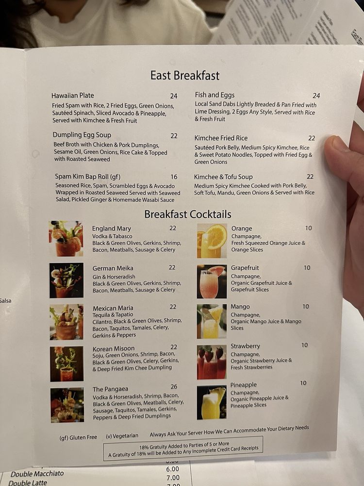 Fried spam with rice, 2 fried eggs, green sauteed spinach, sliced avocado and pineapple, served with kimchi and fresh fruit.